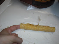 chicken cools get 2 forks and begin to shred the chicken. I use one fork to hold it in placed and then slide the fork over the top of of the chicken. Continue doing so until the chicken is to the desired gradient. at this point I add a little bit more spices if it appears enough spices were not absorbed.3. Heat the tortillas separately in the microwave for about 15 seconds each. After it has been heated place the desired amount of shredded chicken onto the tortilla and tightly roll. Stick finger in both sides to stuff the chicken and add more as needed. secure the roll with a toothpick and set aside for frying (if waiting will later, place in fridge until ready to make).